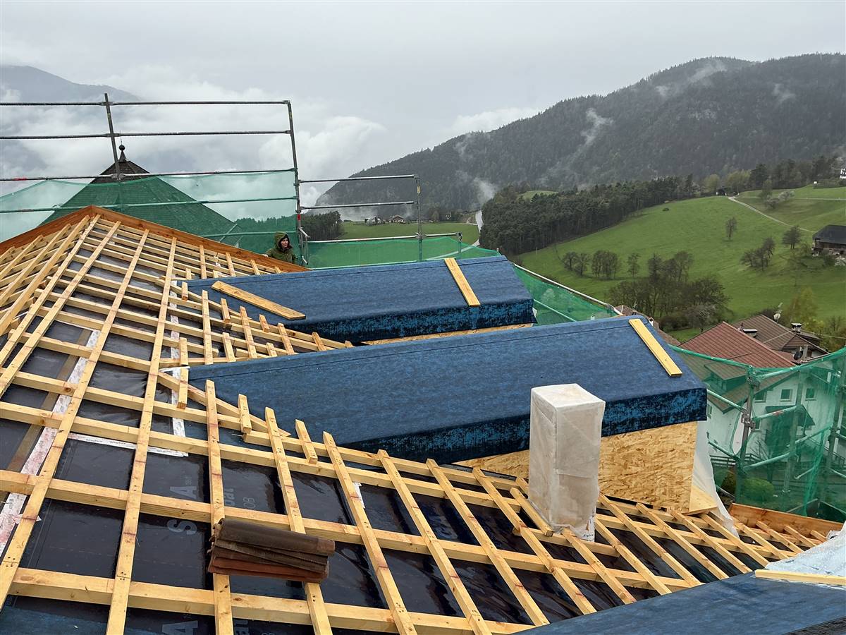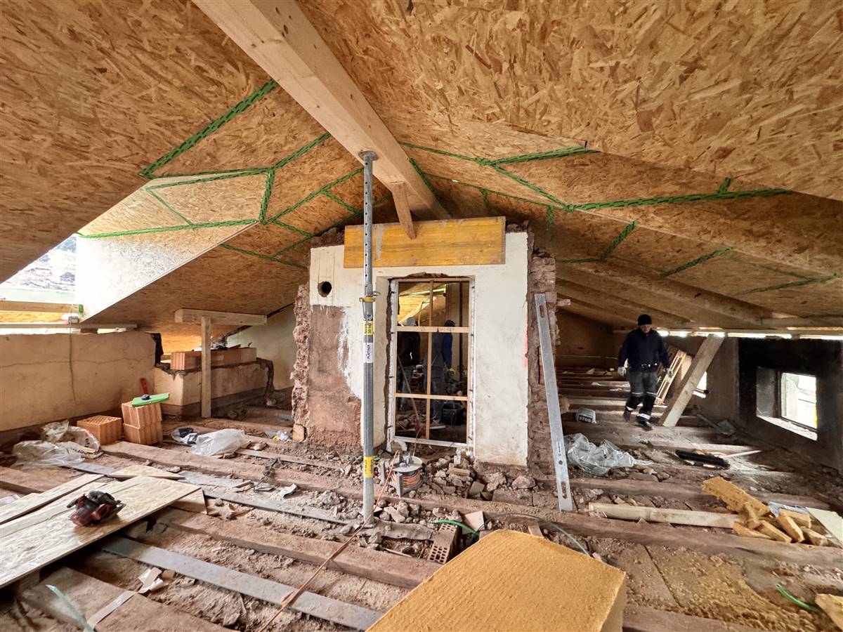 The roof was thermally insulated by installing 19 cm of wood fiber insulation panels, significantly improving the energy performance of the building envelope while ensuring breathability and compatibility with the existing structure.