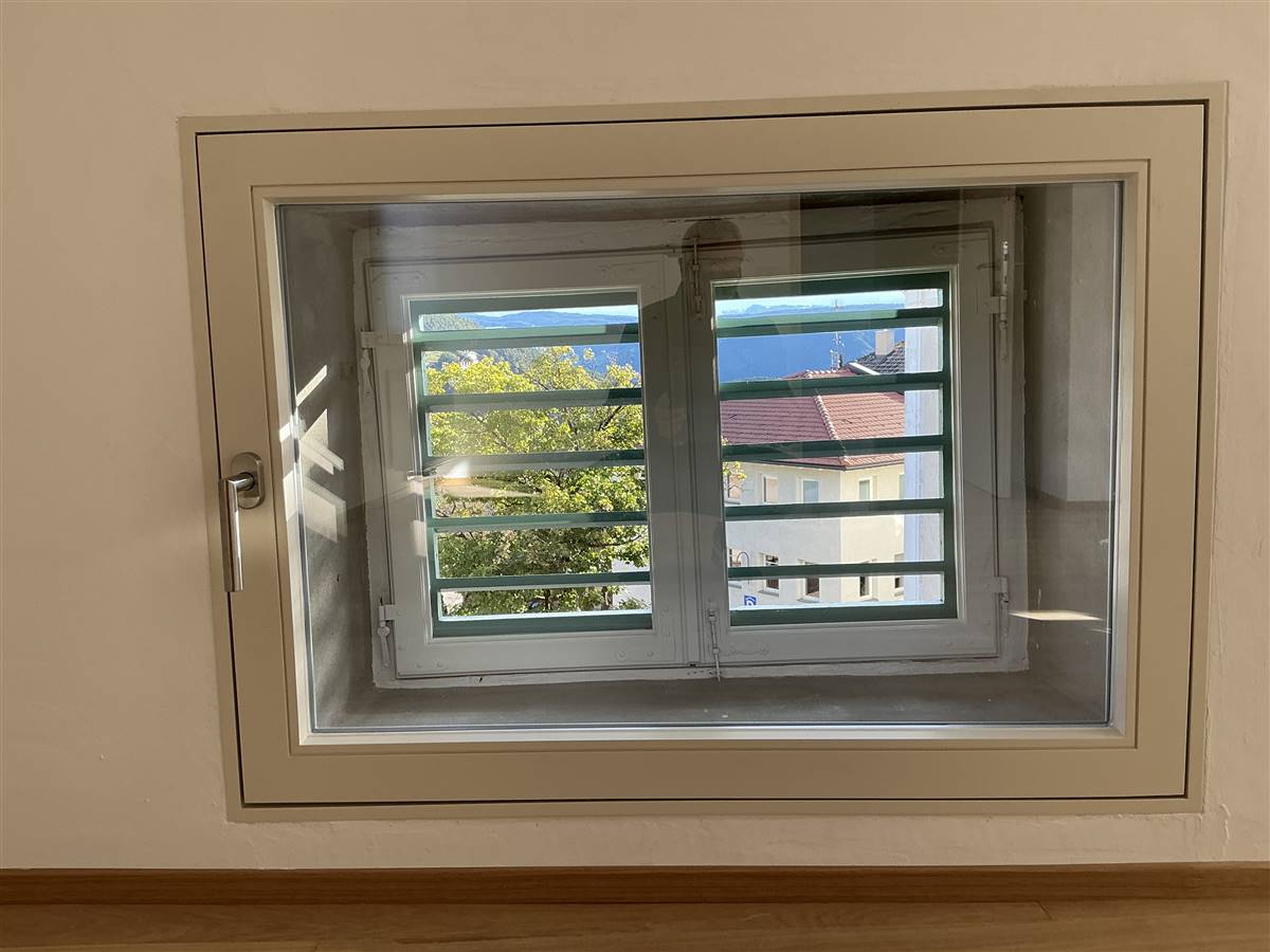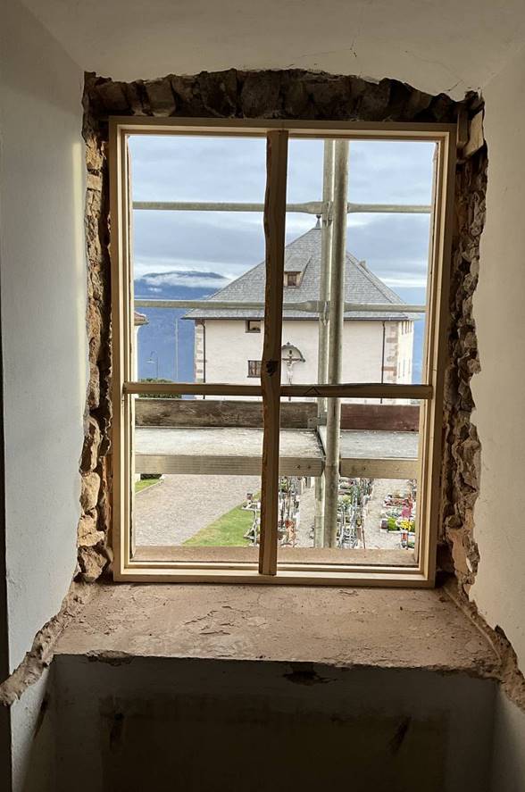 The original historic window was retained and integrated into a “double-layer” solution: traditional external shutters remain in place, while a secondary timber-framed inner window was added on the inside to improve performance without changing the exterior appearance.
