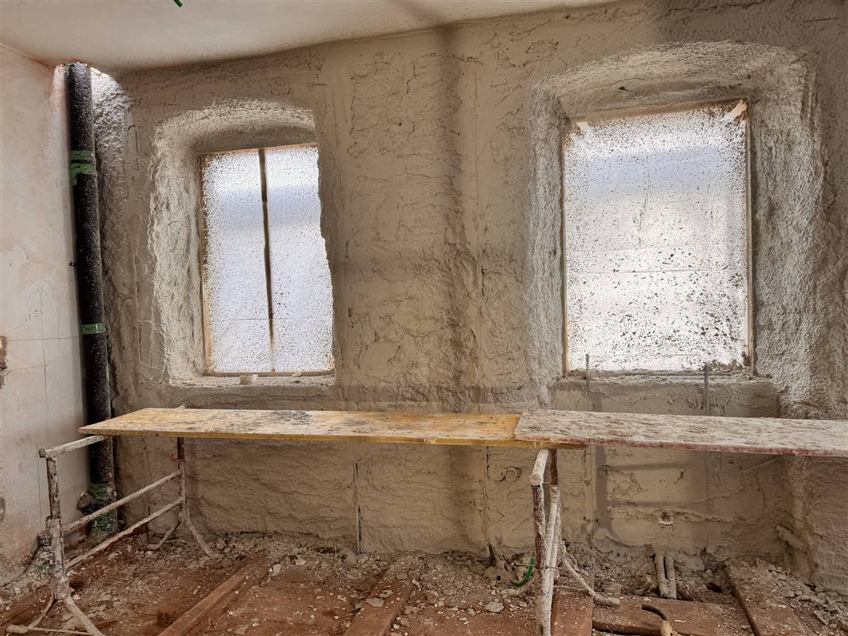 The intervention involved installing a variable-thickness internal insulating plaster based on perlite, applied to the stone masonry to improve thermal performance without altering the historic building’s exterior appearance. This solution reduced the wall U-value from 1.53 to 0.63 W/m²K while remaining compatible with conservation constraints.